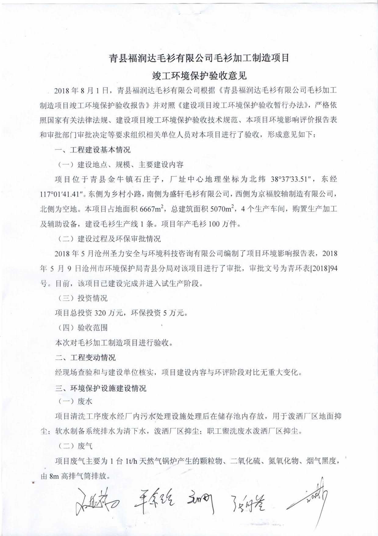 青县福润达毛衫有限公司验收意见