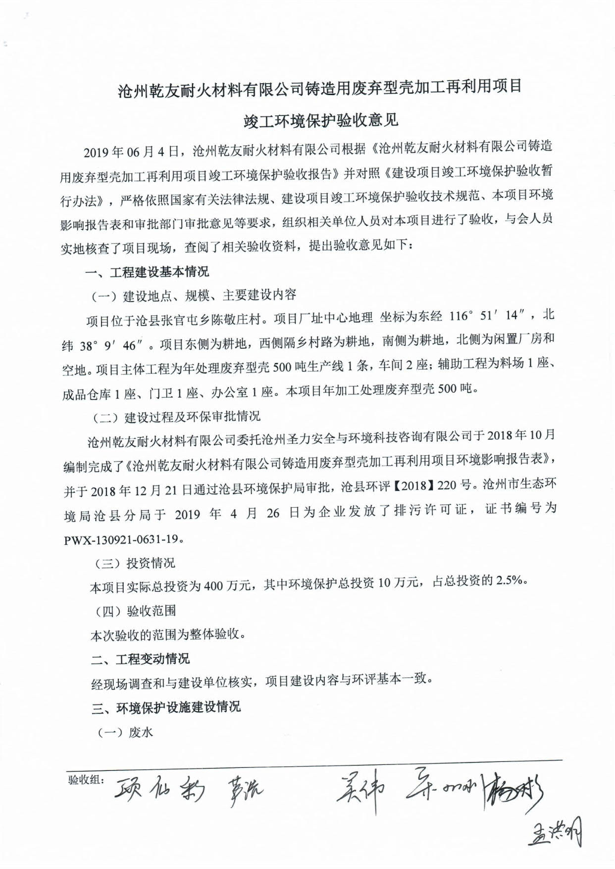 沧州乾友耐火材料有限公司+验收意见
