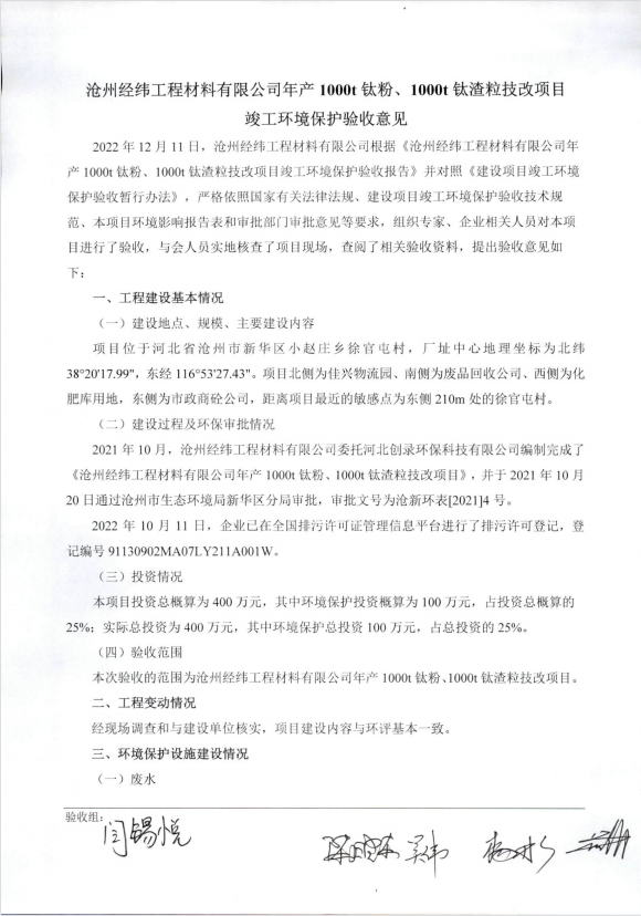 沧州经纬工程材料有限公司年产1000t钛粉、1000t钛渣粒技改项目竣工环境保护验收意见