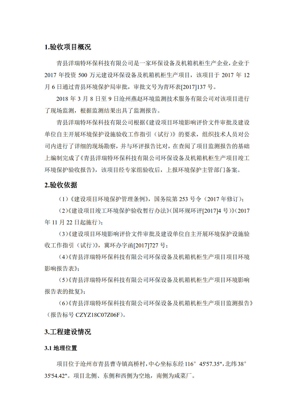 青县洋瑞特环保科技有限公司环保设备及机箱机柜生产项目验收报告