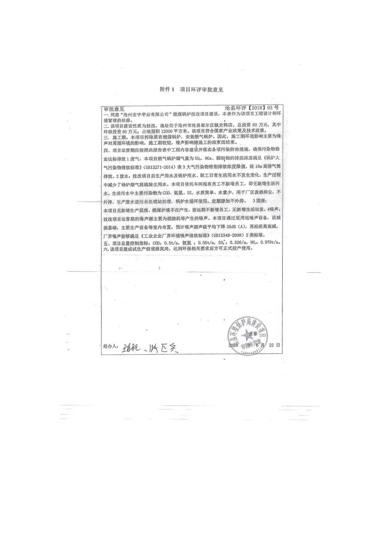 沧州宏宇枣业有限公司燃煤锅炉技改项目竣工环境保护验收报告